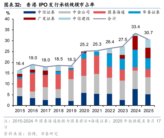 中资券商在港股市场的话语权提升,将更受益于市场修复。本轮港股市场走出相对A股更好的行情,且当前头部中资券商在香港市场上的核心竞争力增强、业务话语权提升,更有望受益于港股市场修复。投行业务表现尤为突出,6家头部中资券商(中信、中金、国泰、华泰、广发、建投)的港股发行承销规模市占率合计已从2015年的18.3%提升至2025年(截至9月17日)的27.3%,其中IPO承销规模市占率合计从16.4%提升至30.7%,市场份额抬升后将更加受益于港股市场的持续修复。