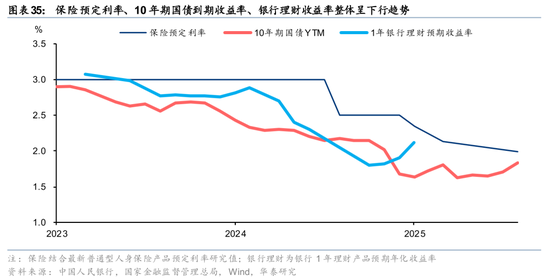 固收产品收益率下行,重塑资产配置体系。当前市场供需环境下,房地产价格走势仍有不确定性,使得房地产作为投资品的吸引力面临挑战,也促使居民在资产配置上更加谨慎。同时,伴随长端利率下行,固定收益类资产的收益率普遍下行。截至2025年8月末,包括保险产品、银行理财、十年期国债到期收益率以及定期存款等主要固定收益类产品的收益率均已降至2%以下,对投资者的资产配置和财富增值带来了显著挑战。