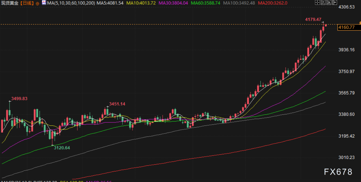 现货金盘中曾触及纪录高位4179.48美元。美国12月期金收涨0.7%,报每盎司4163.40美元。金价今年迄今已飙升约57%。
