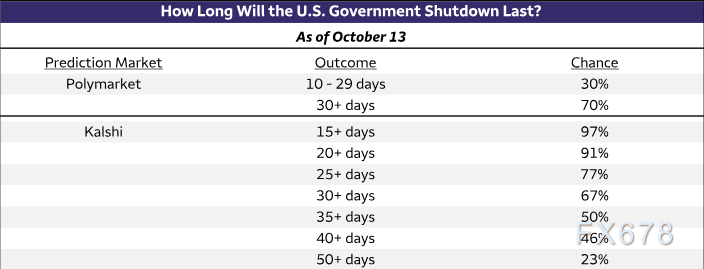 目前看来,能够推动双方达成解决方案的痛点或缓冲机制正日趋难以寻觅。鉴于经济与金融市场尚未出现剧烈阵痛, *** 服务也未发生重大中断,市场对停摆持续时间的预期正不断延长。Polymarket、Kalshi等预测市场平台数据显示,停摆持续至10月底的概率已升至约70%。