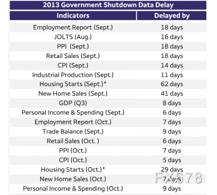 以经济数据发布为例:2013年停摆期间,10月份大部分数据均推迟数周发布。原定10月4日发布的非农就业报告最终延迟至10月22日(延迟了18天)(停摆结束后第六天)才公布;随后11月的就业报告又推迟约一周,所幸劳工统计局当时报告称2013年10月就业调查的回复率仍处于正常范围。同期CPI报告也出现类似延迟,且当年用于计算10月CPI的价格样本采集量仅达常规水平的75%。