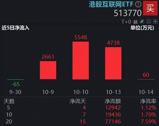 值得注意的是,近期资金借道ETF坚定增仓港股AI核心资产,彰显乐观预期。上交所数据显示,港股互联网ETF(513770)近5日资金累计净流入1.3亿元。