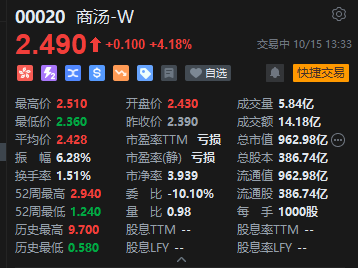 商汤午后拉升,现涨超4%,报价2.49港元,成交额逾14亿港元。