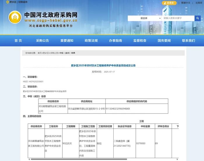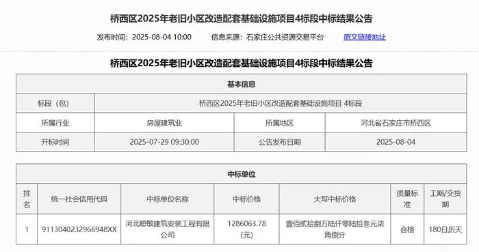 不过,新黄河记者从河北省 *** 采购网、全国公共资源交易平台处获悉,2025年7月起,聪敏公司仍正常参与投标并中标三个项目:2025年7月17日,中标肥乡区2025年农村饮水工程维修养护中央资金项目,采购人为邯郸市肥乡区水利局,中标额107.9万元;2025年8月13日,中标2024年第二批衔接资金肥乡区帮扶车间项目,采购人为邯郸市肥乡区农业农村局,中标额361.8万元;2025年8月4日,中标石家庄市桥西区2025年老旧小区改造配套基础设施项目4标段,招标人为石家庄市桥西区住房和城区建设局,项目资金为100%财政资金,中标额128.6064万元。