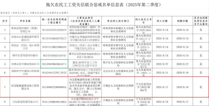 近日,新黄河记者于赤峰市宁城县人民 *** 官网获悉,宁城县人社局通报:2025年3月31日,宁城县人力资源和社会保障局(下称“宁城县人社局”)就聪敏公司拖欠白某、王某等168名农民工工资一案立案调查,核实欠薪金额278.72万元。2025年4月17日、6月4日,宁城县人社局先后作出宁人社监令字[2025]第018号、第021号《劳动保障监察责令改正决定书》,责令河北聪敏公司限期付薪,但其逾期未履行。6月16日,宁城县人社局对其作出宁人社监罚字[2025]第002号《劳动保障监察行政处罚决定书》;6月17日,再作出宁人社监列决字[2025]第001号《列入拖欠农民工工资失信联合惩戒对象管理名单决定书》,将其纳入失信惩戒名单,公布日期为2025年6月26日。