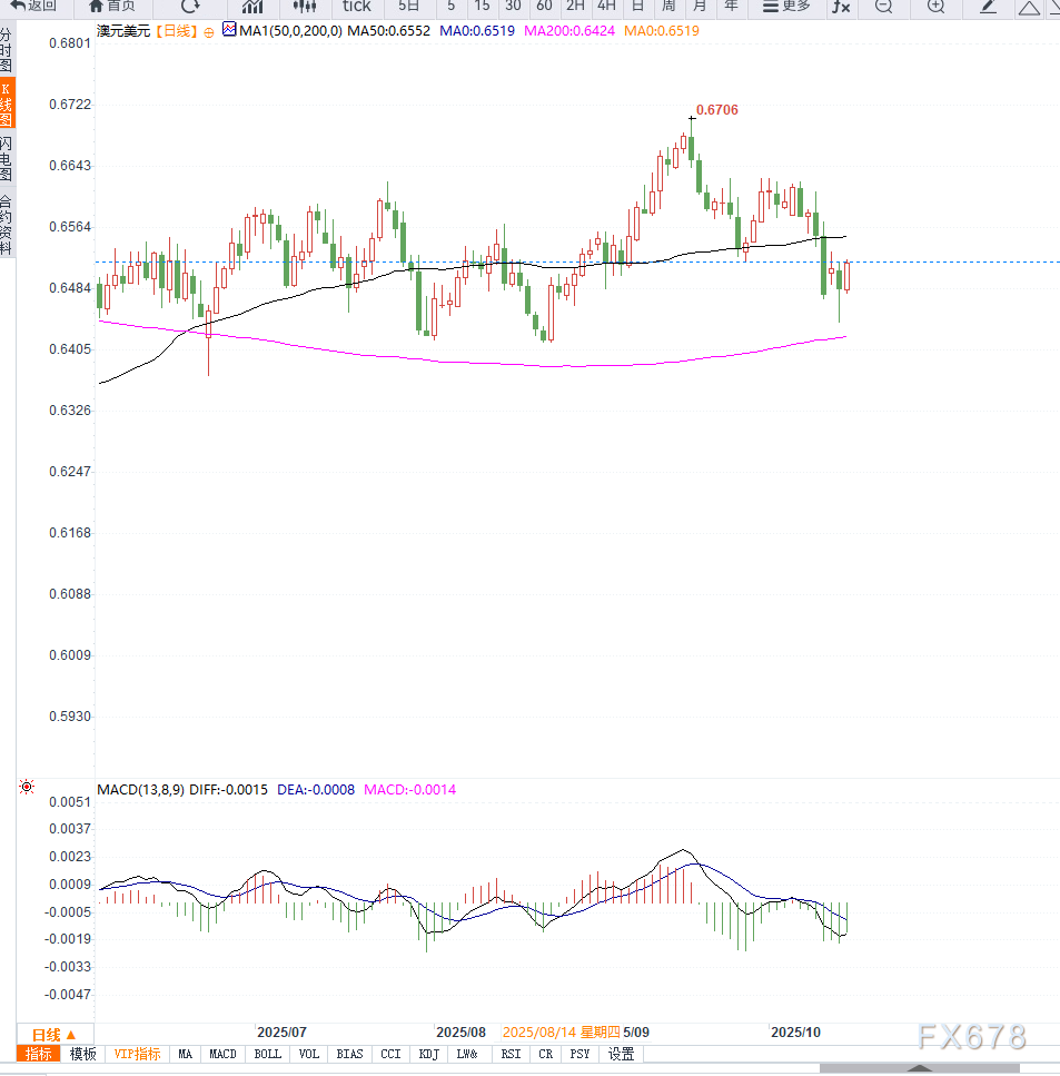 技术图形显示,仍运行于下降通道中,整体趋势偏空。14日RSI位于50以下,表明市场情绪仍然谨慎。短线支撑位在0.6450附近,若跌破该位,可能测试8月低点0.6414与5月低点0.6372。