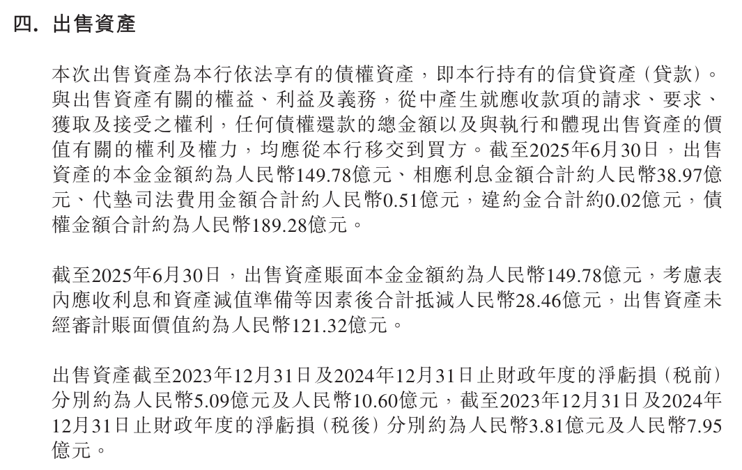 公告显示,本次拟出售的资产为广州农商行依法享有的债权资产,即持有的信贷资产(贷款),涵盖本金、利息、代垫司法费用及违约金等全部相关权益,截至2025年6月30日,该批资产本金余额约149.8亿元,对应利息合计约39亿元,代垫司法费用约0.5亿元,违约金约0.02亿元,债权总额合计约189.3亿元;经表内应收利息及资产减值准备等因素抵减后,未审计账面价值约121.3亿元,初步更低 *** 代价较账面价值轻微溢价0.68亿元。