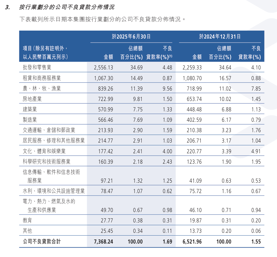 分行业来看,部分行业不良率呈现增长态势:农、林、牧、渔业2024年末不良率为7.85%,2025年中报进一步升至9.56%;批发和零售业的不良率也从2024年末的4.10%上涨至4.48%,这些行业的资产质量恶化情况需要警惕。