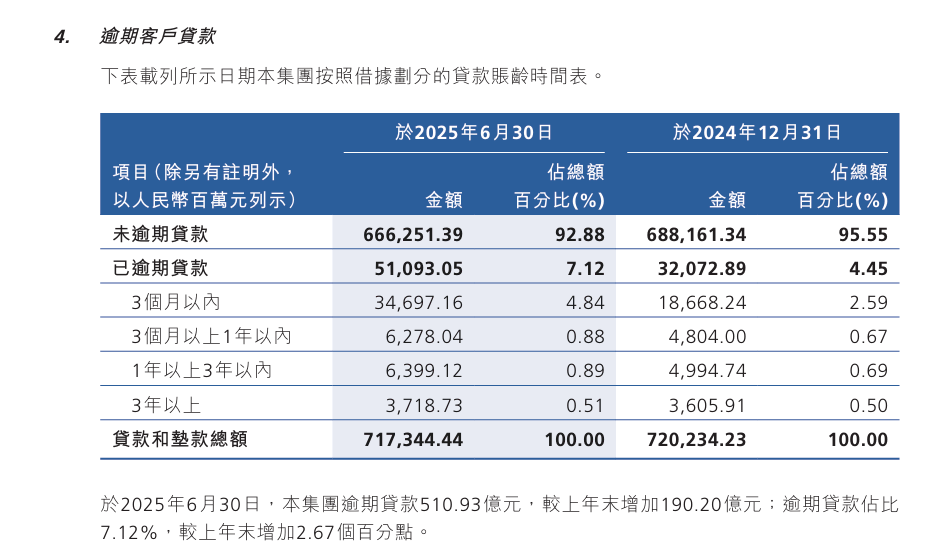 进一步观察资产质量细节,2025年上半年,该行逾期贷款规模大幅增长,截至6月末达到510.9亿元,较上年末增加190.2亿元,逾期贷款占比也从4.45%升至7.12%,增幅十分明显。更值得警惕的是不良贷款偏移度,也就是90天及以上逾期贷款与不良贷款的比值——2025年6月末,该行“3个月以上1年以内”“1年以上3年以内”“3年以上”的逾期贷款合计约164亿元,而同期账面不良贷款总额仅为142.2亿元,据此计算的不良贷款偏移度约为115.3%,这一数值远超100%的监管警戒线。