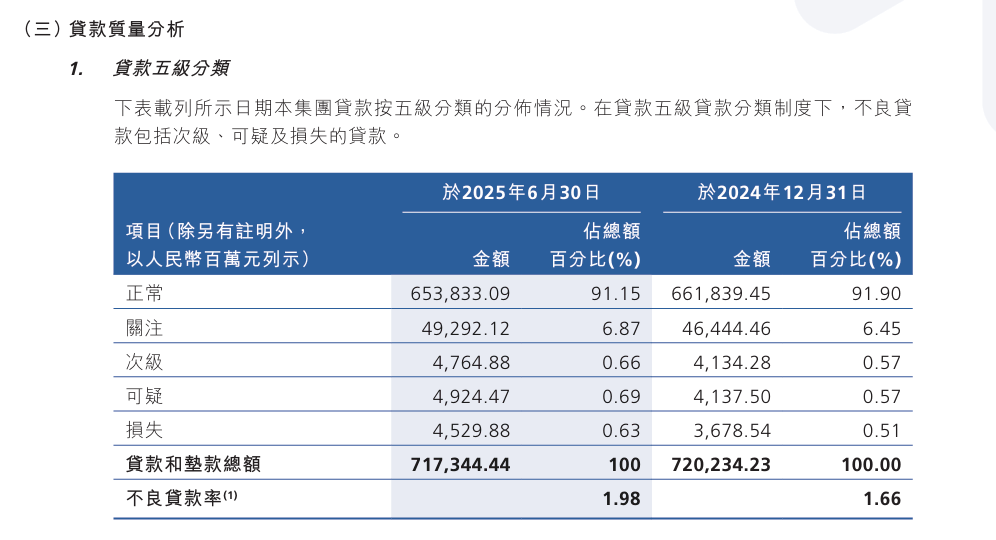 从监管指标来看,不良贷款率从2024年末的1.66%升至2025年中报的1.98%,拨备覆盖率从184.34%降至169.75%,贷款拨备率从3.06%升至3.36%。尽管当前拨备覆盖率仍高于行业平均水平,但不良率上升叠加贷款规模收缩,客观上反映出该行在信贷资产质量管控上的压力。