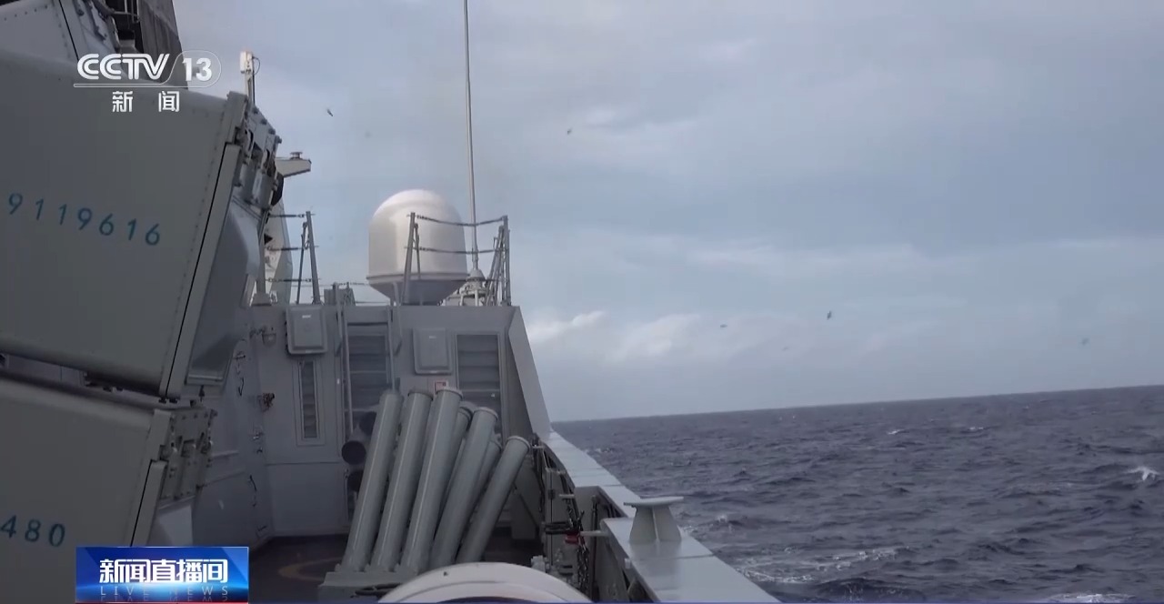 硝烟尚未散尽,编队运动途中空中特情随之袭来,各舰立即高速机动散开,发射干扰弹实施对空抗击。