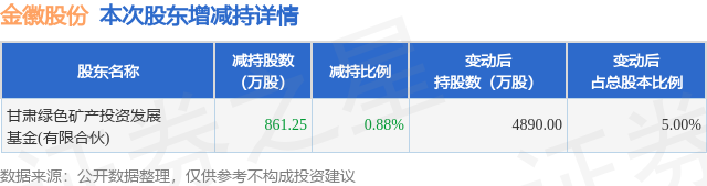 证券之星消息,10月15日发布公告《金徽股份:金徽股份关于持股5%以上股东权益变动触及5%整数倍的提示性公告》,其股东甘肃绿色矿产投资发展基金(有限合伙)于2025年10月9日至2025年10月14日间合计减持861.25万股,占公司目前总股本的0.8806%,变动期间该股股价下跌2.08%,截止10月14日收盘报14.15元。