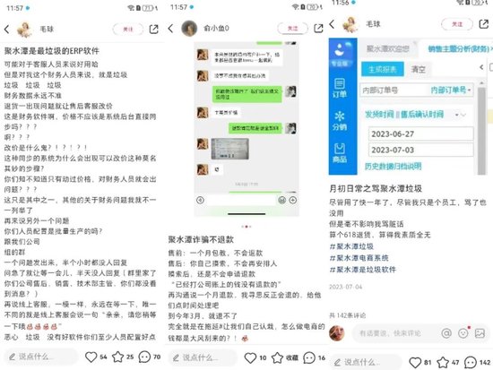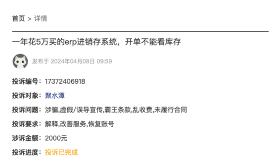 消费者投诉 平台“黑猫投诉”显示,关于“聚水潭”的投诉达到433条,内容包括虚假宣传、不退款、试用版和实际使用版不同、售后服务差等。