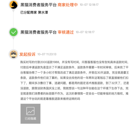 退款问题上,另一位消费者表示,购买时写的付款2000元返款1988元,但并没有写时间,问 *** 也没有告知具体返款时间。