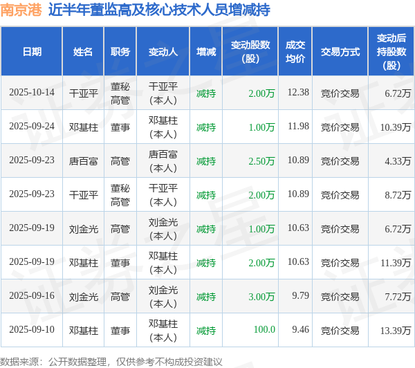 南京港近半年内的董监高及核心技术人员增减持详情如下: