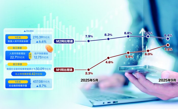 9月末,M1(狭义货币)、M2“剪刀差”(M2同比增速减去M1同比增速)收窄至1.2个百分点,刷新今年初M1统计口径调整以来的新低,折射出企业生产经营活跃度提升、个人投资消费需求回暖。