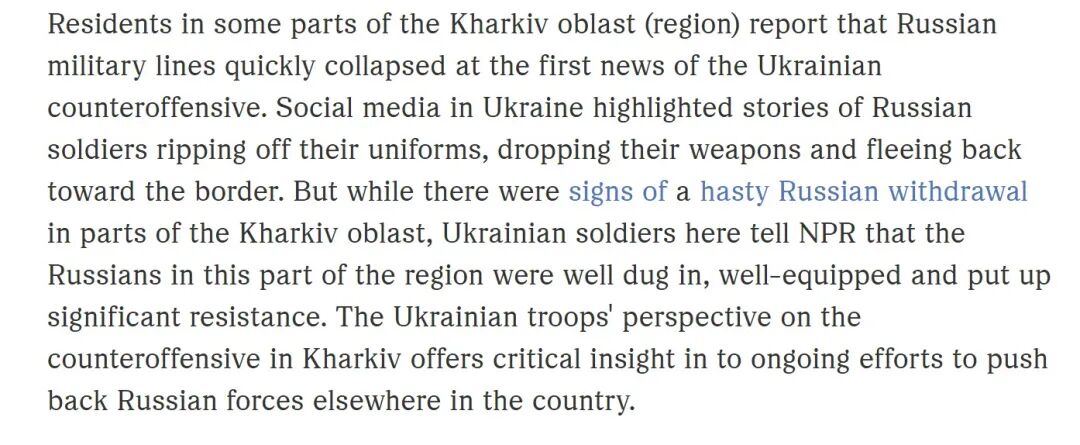 另据美国国家公共广播电台2022年9月29日报道,尽管有迹象表明俄罗斯在哈尔科夫州部分地区仓促撤退,但这里的乌克兰士兵表示,该地区的俄罗斯军队已经做好了充分准备,装备精良,并进行了顽强的抵抗。