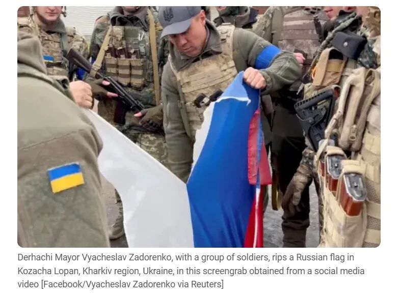 对网传视频进行反向搜索后发现,2022年9月已经有不少媒体报道过相同画面。半岛电视台引用该画面时标注:这张截图是从社交平台视频中获得的,在乌克兰哈尔科夫州科扎恰洛潘,德尔哈奇市市长Viacheslav Zadorenko和一群士兵撕毁了俄罗斯国旗,图源路透社。
