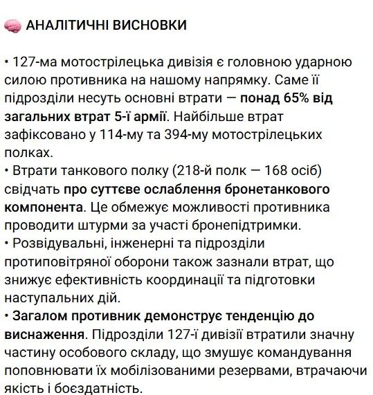 10月9日,乌克兰第110独立机械化旅在其Telegram频道上表示:“(俄军)第127摩托化步兵师仍然是俄军在新帕夫利夫卡方向的主要突击力量……该师部队损失惨重,占第五集团军总损失的65%以上。损失更大的是第114和第394摩托化步兵团……总体而言,敌方部队正呈现疲态。第127师的部队损失了相当一部分人员,这迫使指挥部不得不补充动员,并降低其战备水平。”不过,其中并未提及“俄军成建制投降”。