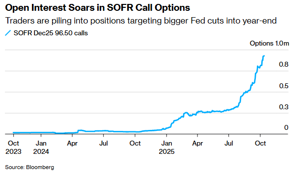与有担保隔夜融资利率(SOFR)挂钩的期权近期交易活动显示,市场正在积累押注——美联储可能在本月晚些时候或12月的会议上降息50个基点。这一幅度超过了当前利率互换市场所定价的两次25个基点降息。