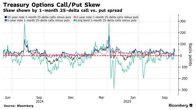 美国国债期权偏斜数据显示,美国10年期国债期货“看涨期权对冲溢价”相对于“看跌期权”近期已升至4月以来的更高水平。这表明,相较于对冲国债抛售风险,交易员更愿意为对冲国债上涨(即收益率下跌)风险支付更高溢价。在长期端(长期国债期权),经过过去几周“偏向看跌期权”的走势后,偏斜指标已回落至接近中性水平。