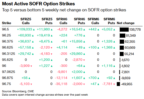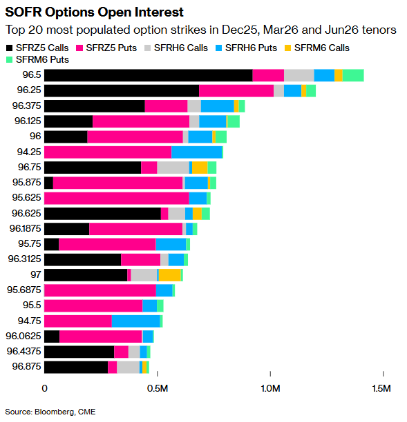 在2025年12月、2026年3月和2026年6月到期的SOFR期权中,96.50执行价的持仓量仍居首位,这主要得益于该执行价下大量2025年12月看涨期权的持仓。近期交易流向包括:直接买入2025年12月SOFR期权(SFRZ5)的96.50看涨期权,以及买入SFRZ5 96.50/96.5625看涨期权价差和SFRZ5 96.50/96.625看涨期权价差。