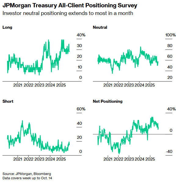 在截至10月14日的一周,摩根大通(JPMorgan Chase & Co.)对客户的调查显示,中性持仓比例升至一个月来更高水平。同期,投资者的空头持仓下降4个百分点,多头持仓与上周持平。