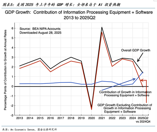 2025年上半年,信息处理设备和软件的投资增长了28.3%,为GDP增速贡献了1.5个百分点,几乎贡献了GDP增速的全部。二季度,软件投资的年化增长率达到了198%,主要由企业对数字化转型和AI相关能力的需求推动。