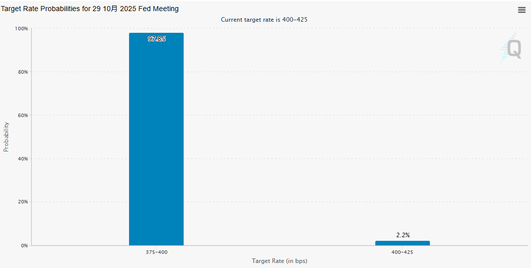 根据芝商所的FedWatch工具显示,市场目前几乎完全预期美联储将在10月份的会议上降息25个基点,可能性为97.8%。
