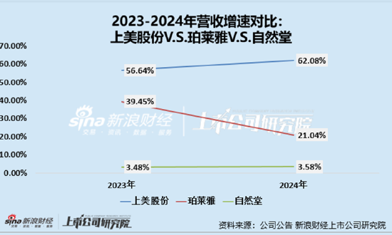 与本土头部企业相比,自然堂的增速差距更为明显,业绩颓势尽显。2023年至2024年,营收分别增长39.45%和21.04%,上美股份营收分别增长56.64%和62.08%,而自然堂的营收仅分别同比增长3.48%、3.58%。同期,珀莱雅归属母公司股东的净利润分别增长46.06%和30.00%,上美股份净利润分别增长213.5%和74%,而自然堂2024年经调整净利润甚至出现负增长。