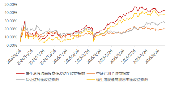 从2024年“924”行情以来,恒生港股通高股息低波动全收益指数累计涨幅42.93%,不仅大幅跑赢同期A股主要红利类指数,如中证红利全收益指数(20.91%)、深证红利全收益指数(27.50%),也优于部分同期其他港股主要红利类指数,如恒生港股通高股息率全收益指数的37.97%。