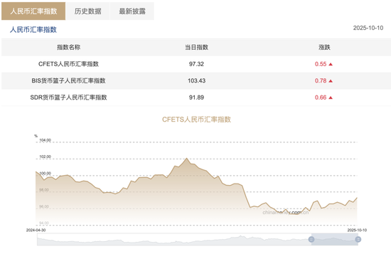 除了人民币兑美元汇率,人民币对一篮子货币近期也小幅走高。中国外汇交易中心公布数据最新显示,10月10日当周三大人民币汇率指数全线上涨,CFETS人民币汇率指数创2025年4月以来新高,BIS货币篮子人民币汇率指数创2025年4月以来新高,SDR货币篮子人民币汇率创2025年4月以来新高。