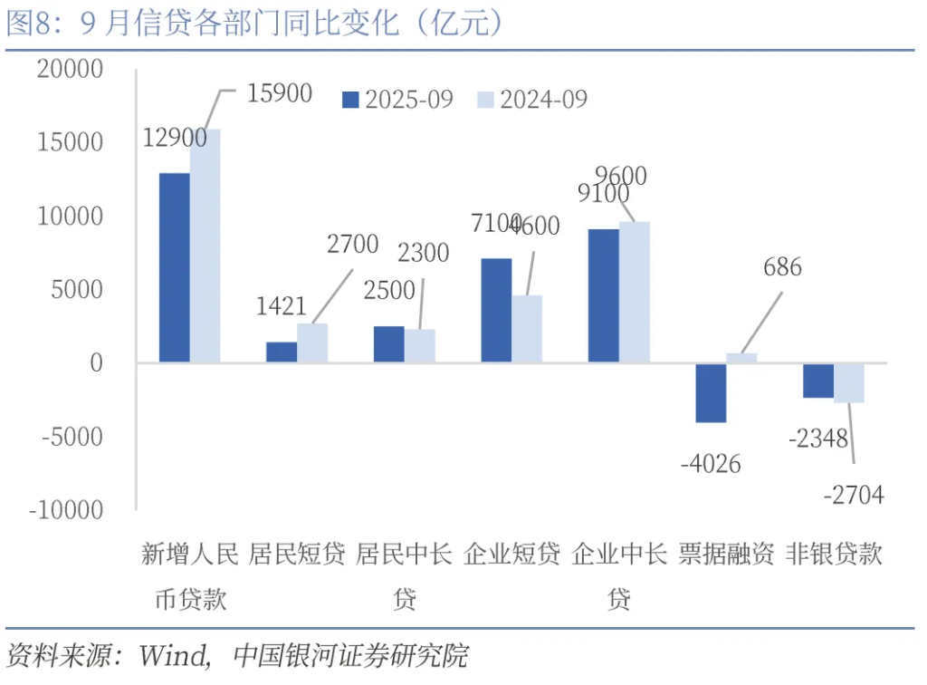 9月金融机构新增人民币贷款1.29万亿元,同比少增3000亿元。居民短贷同比少增1279亿元,居民中长期贷款同比多增200亿元。9月地产销售好于去年同期支撑居民中长期贷款同比多增。企业信贷不及去年同期主要来自票据融资的拖累。企业短贷同比多增2500亿元,企业中长贷同比小幅少增500亿元。票据融资同比少增4712亿元,主要由于去年同期有较为明显的票据冲量现象,而今年月末票据利率上行,无明显的冲量现象。非银贷款同比增加356亿元。