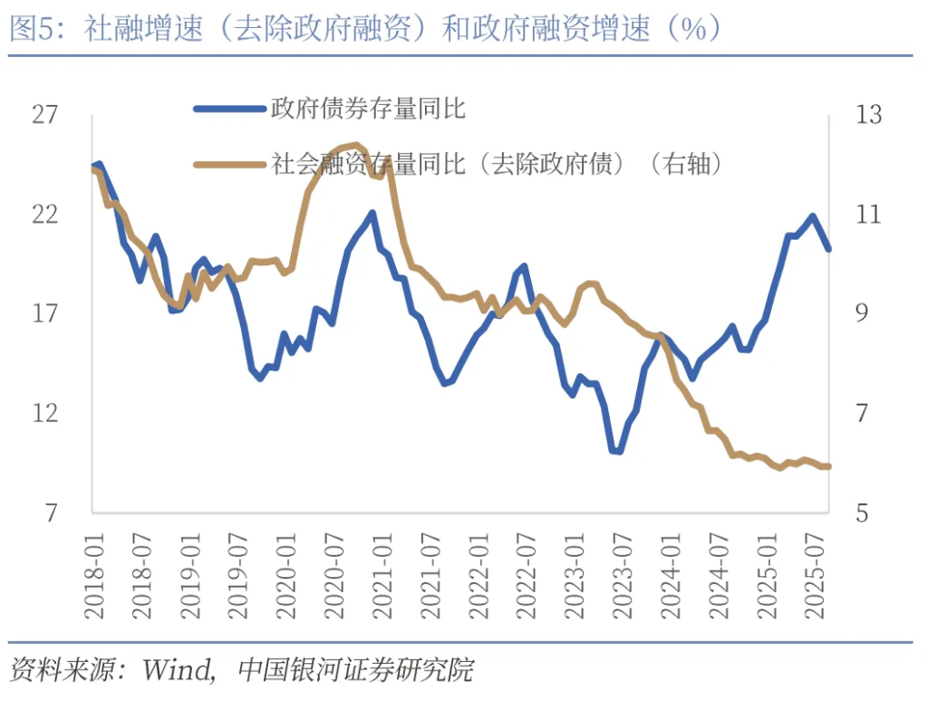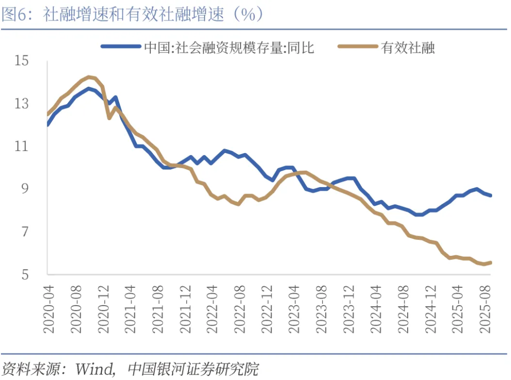 今年和去年 *** 债券发行节奏错位,去年 *** 债券从9月开始加速发行,由于基数效应,四季度 *** 债券融资对社融增速的拉动作用可能减弱。有效社融增速(中长期贷款+委托+信托+直接融资)为5.56%(前值5.48%),环比转为上行。