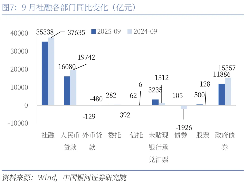 9月新增社融同比少增2297亿元,同比多增的项目包括未贴现银行承兑汇票、企业直接融资和对实体的外币贷款,分别同比多增1923亿元、2403亿元和351亿元。同比少增的项目则主要包括对实体的人民币贷款和 *** 债券融资,分别同比少增3662亿元和3471亿元。