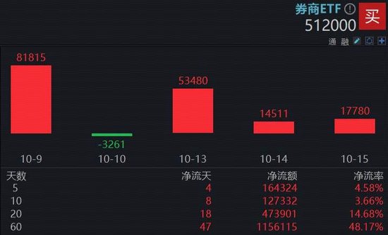 值得注意的是,券商板块的高确定性吸引资金持续涌入。上交所数据显示,券商ETF(512000)近5日有4日获资金增仓,合计达16.43亿元。