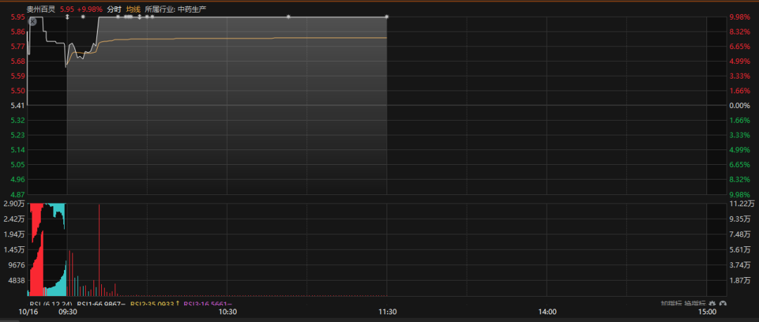医药股16日盘中再度活跃,盘中20%涨停,涨停斩获3连板,贵州百灵盘中直线拉升,1分钟内封住涨停。
