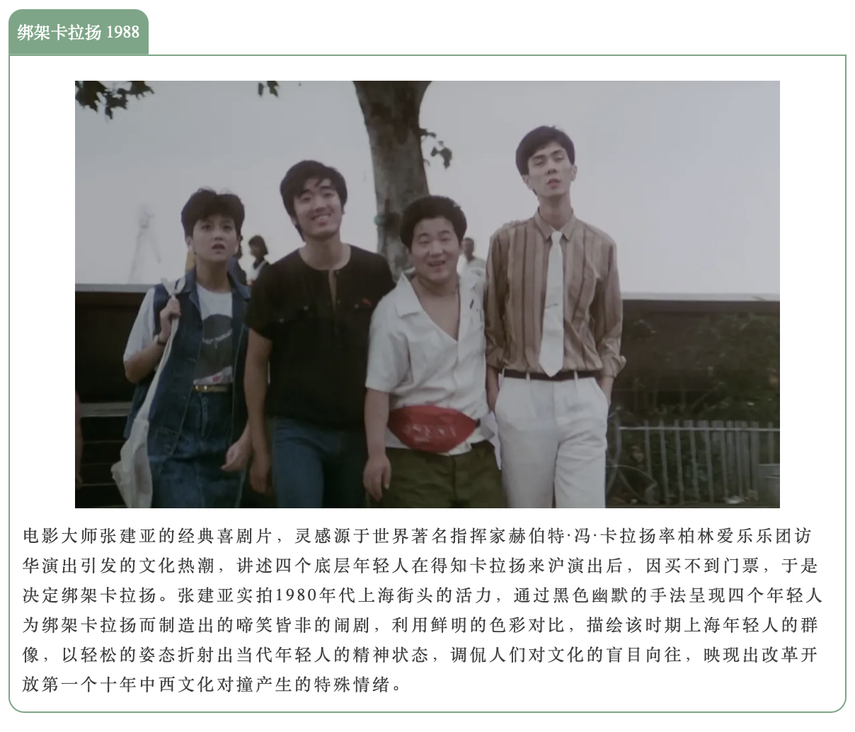 张建亚导演的《绑架卡拉扬》(1988)灵感源自1980年代柏林爱乐乐团访华的文化热潮,讲述四个底层青年为看演出“策划绑架”指挥家的荒诞故事,通过黑色幽默折射改革开放初期年轻人对文化的热情与迷茫。