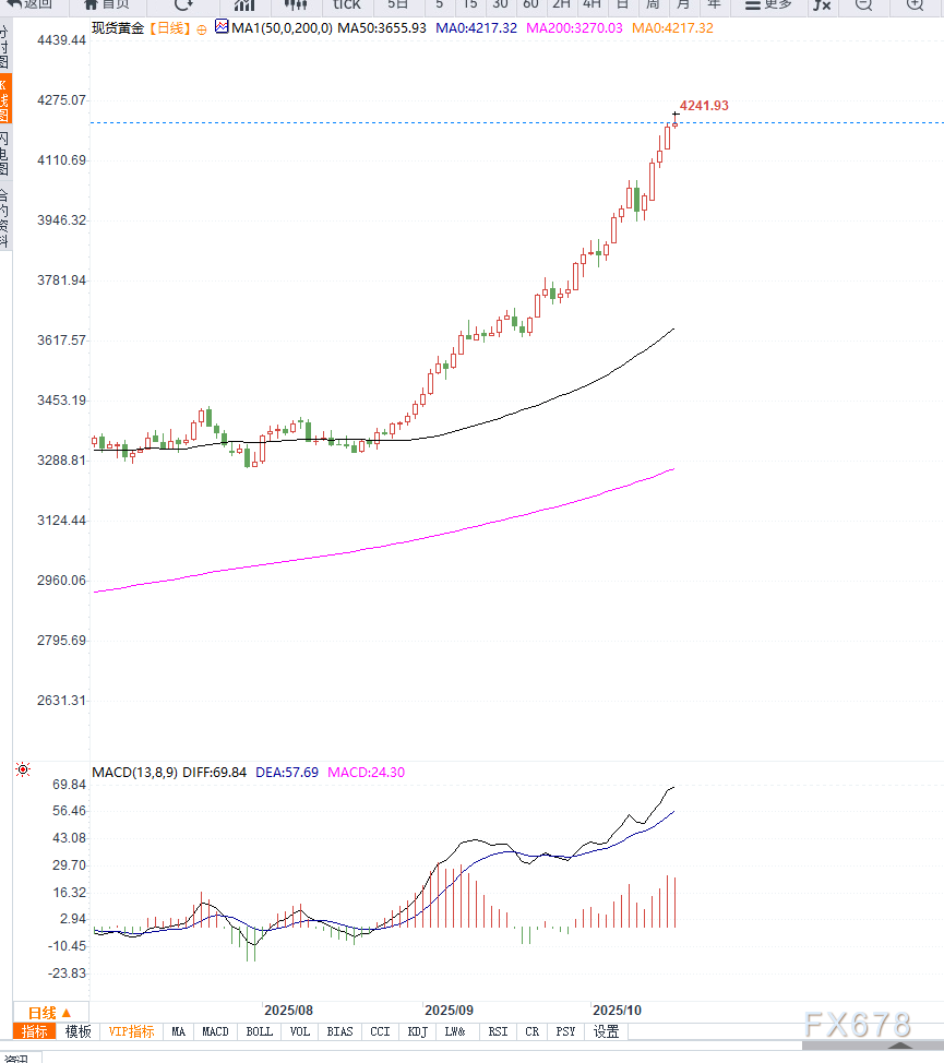 但需注意,日线RSI指标显示市场已处于严重超买区间(>80),短线存在技术性回调风险。若金价回调,首个支撑位位于4180–4175美元区间,其次为4135–4100美元,跌破则可能触发部分获利了结盘。