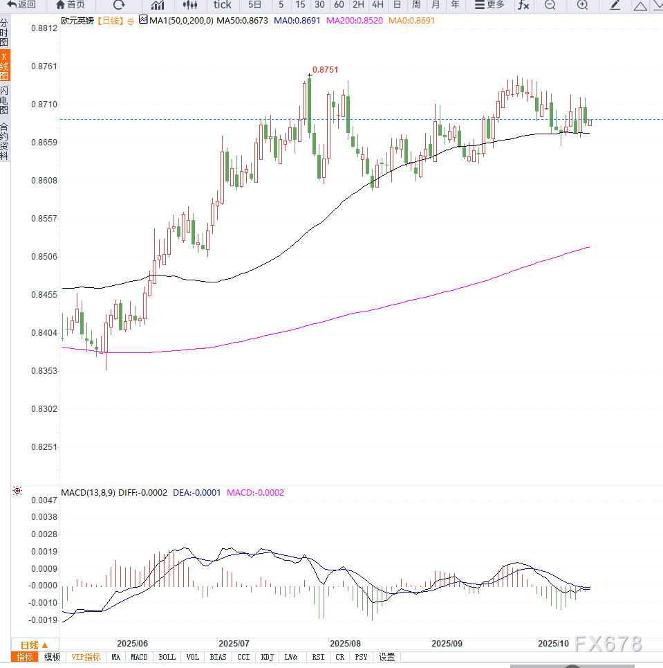 技术图形显示,EUR/GBP自近期低点反弹后维持区间震荡。短线支撑位关注0.8675,若有效跌破,可能测试0.8650区域;阻力位位于0.8720,突破该区域则可能延伸至0.8750附近。