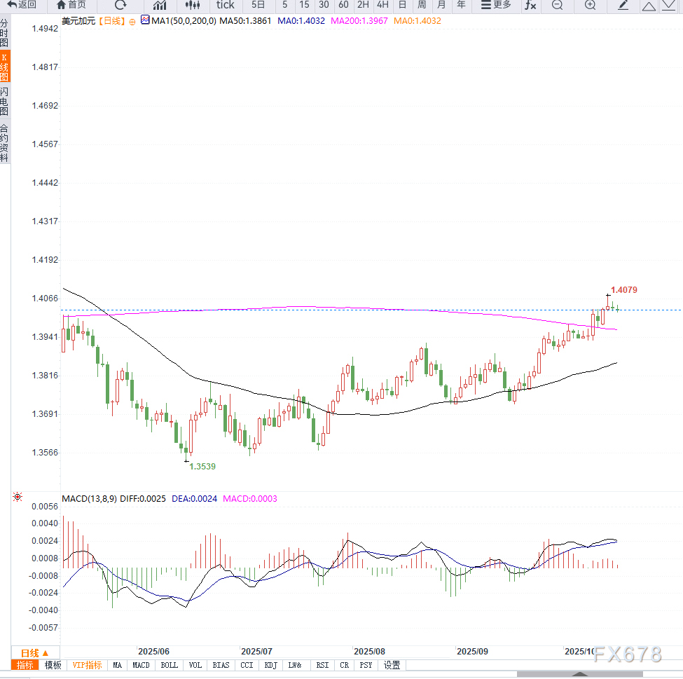 短线技术指标显示动能偏空,但随机震荡指标已进入超卖区,暗示短期或有技术性反弹。上行方向初步阻力位于1.4080~1.4100区间,若突破此区域,可能重新测试1.4150的前高压力。