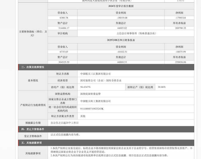 北京产权交易所网站公告的内容显示,本次交易的 *** 方为中国航天三江集团有限公司。交易完成后,标的企业(即科工火箭)不得再继续使用国家出资企业及其子企业的字号、经营资质和特许经营权等无形资产,不得继续以国家出资企业子企业名义开展经营活动。
