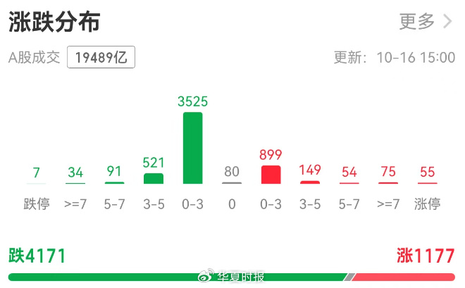全市场个股多数飘绿,收盘时下跌个股达4171只,其中7只个股跌停;上涨个股为1177只,其中55只个股涨停。