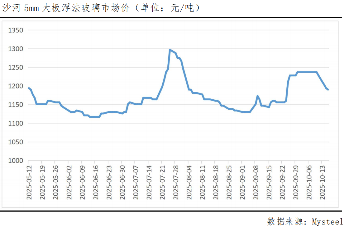 9月下旬,在美联储降息以及节前下游备货的提振下,现货价格走出一波反弹,但国庆假期后,玻璃现货价格持续回落,Mysteel数据显示,截至10月16日,沙河5mm大板浮法玻璃市场价为1190元/吨,较前一日下跌4元/吨,跌幅0.34%,较节前的高点(9月30日,1237元/吨)下跌47元/吨,跌幅3.80%。