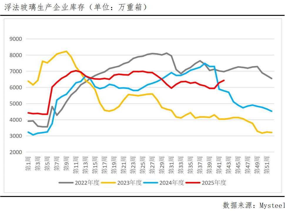 去年国庆假期后,玻璃企业库存显著走低,而今年国庆假期后,玻璃企业库存已连续两周增加,两相对比,节后持续累库成为压制价格的重要因素。据Mysteel数据,截至9月19日,玻璃生产企业库存为6427.56万重箱,较前一周增加145.16万重箱,周环比增幅2.31%。