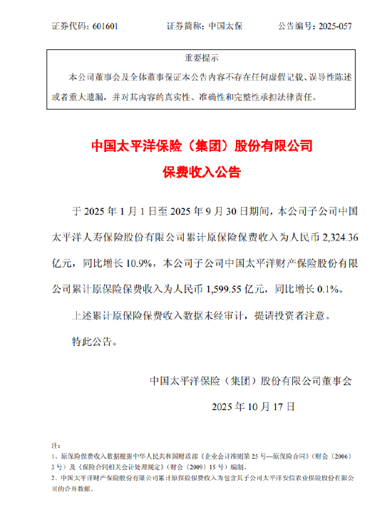 10月16日金融一线消息,(601601/02601)发布公告,报告其子公司中国人寿保险股份有限公司在2025年1月1日至2025年9月30日期间累计原保险保费收入为2324.36亿元,同比增长10.9%。同时,子公司中国太平洋财产保险股份有限公司的累计原保险保费收入为1599.55亿元,同比增长0.1%。公告中提到的累计原保险保费收入数据未经审计。