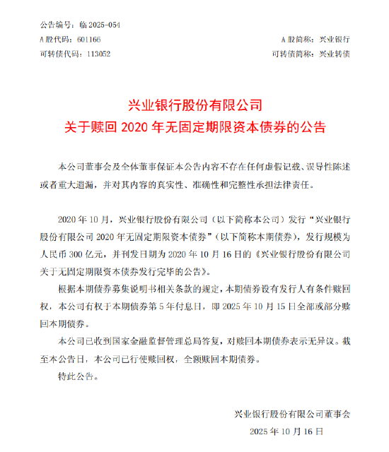 兴业银行表示,根据本期债券募集说明书相关条款的规定,本期债券设有发行人有条件赎回权,该行有权于本期债券第5年付息日,即2025年10月15日全部或部分赎回本期债券。该行已收到国家金融监督管理总局答复,对赎回本期债券表示无异议。截至本公告日,该行已行使赎回权,全额赎回本期债券。