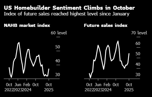 美国全国住宅建筑商协会(NAHB)与发布的市场状况指数10月上升5点至37,为4月以来更高。指数低于50意味着更多建筑商认为市场状况糟糕而非良好。接受彭博调查的经济学家预计该指数小幅上升至33。