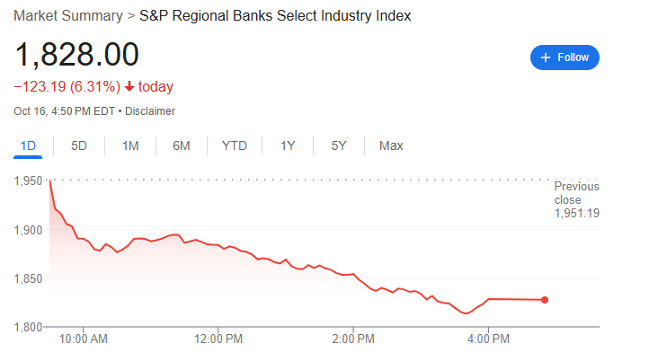 受此消息影响,标普区域性银行精选行业指数(S&P Regional Banks Select Industry Index)周四暴跌6.3%,创下数月来最差单日表现。Zions股价重挫13%,Western Alliance下跌11%。恐慌情绪迅速蔓延,拖累整个银行业板块,74家美国大型银行的总市值在一天之内抹去了超过1000亿美元。