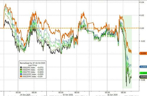 随着信贷担忧推动避险需求,美国国债价格在隔夜全线飙升,两年期国债收益率跌至了2022年9月以来的更低水平,10年期美债收益率则进一步跌破了4%关口,尾盘下跌6.9个基点至3.976%,刷新了4月“解放日”关税以来的新低。